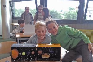 Ganz andere Entdeckungen tätigten die SchülerInnen der Klasse 5e. Ihre Entdeckungen im Schuhkarton nahmen die Zuschauer mit zu den Planeten des Sonnensystems oder in die Tiefen des Dschungels.