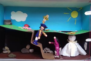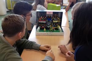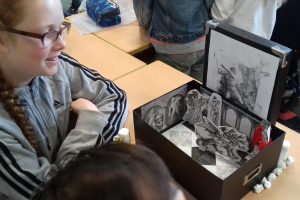In den Profilstunden hatte sich die 5d auf eine Entdeckungsreise zu den Mythen und Sagen der griechischen und römischen Antike gemacht und ihre Ergebnisse als sichtbare Geschichte(n) in Schuhkartons präsentiert.