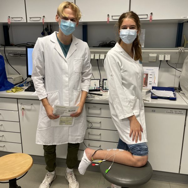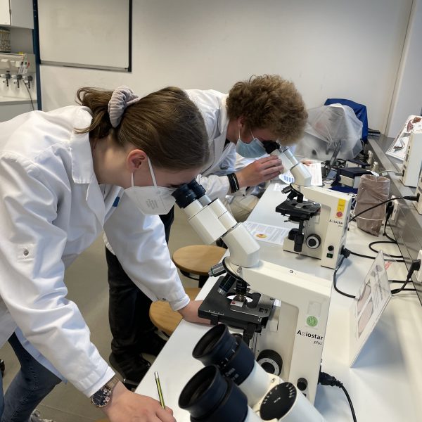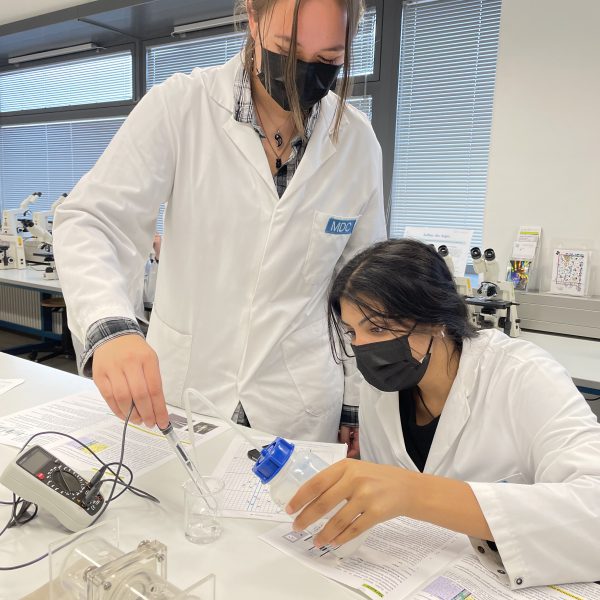 Im Labor angekommen, starteten wir direkt mit einem Versuch zur optischen Täuschung und der Verarbeitung dieser neuen Informationen im Gehirn. Nach diesem ersten Versuch im Foyer und ausgestattet mit Laborkitteln ging es anschließend im Versuchslabor in Zweiergruppen los. Die Auswahl an Versuchen war groß, wir konnten eigenständig experimentieren und jede Gruppe stellte am Ende ein Ergebnis vor. Zur Auswahl standen uns folgende Versuche: ein Versuch zur Informationsübertragung zwischen dem Gehirn und den Muskeln, unterschiedliche Alzheimertests, die unter anderem das Nachzeichnen eines Labyrinthes beinhalteten, sowie Versuche zum Messen von Membranpotentialen und Diffusionsvorgängen. Weitere Versuche beinhalteten den Achillessehnenreflex, welcher die Impulsweiterleitung an myelinisierten Nervenfasern zeigte, und ein Versuch mit einem Regenwurm, der die Impulsweiterleitung an nicht myelinisierten Nervenfasern demonstrierte, sowie ein Versuch zu den bewussten und unbewussten hirngesteuerten Bewegungen am Beispiel des Auges.