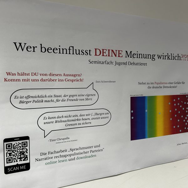 Die Schülerinnen und Schüler dieses Seminarfachs präsentierten Einblicke in Debattenkultur, politische Kommunikation und die Vorbereitung auf „Jugend debattiert“. Sie analysierten politische Inszenierungen und führten eigene Debattenformate vor.